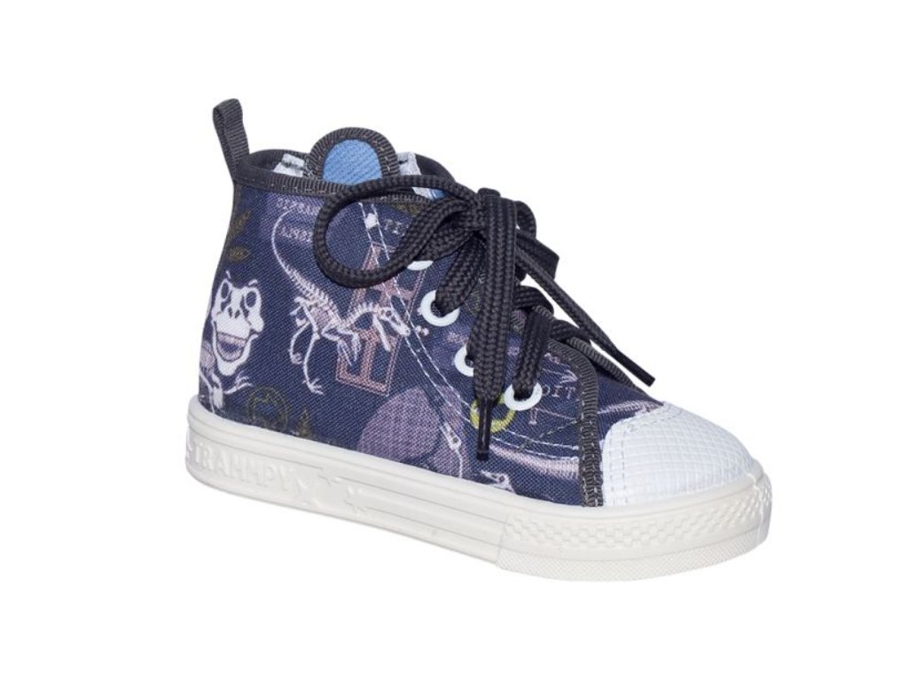 Dětské tenisky bighorn na tkaničku a z boku na zip. Materiál je vysoce kvalitní potištěná bavlna v tmavě šedé barvě s motivem dinosaurů. Lehká pružná podešev vyrobená z PVC. Stélka je vyrobena z přírodní kůže a pružné pěny s aktivním uhlím. Kůže absorbuje přebytečnou vlhkost a aktivní uhlí nepříjemné pachy, což chodidlu dává pocit svěžesti. Na vyztužené patě obuvi je bezpečnostní reflexní pásek pro dobrou viditelnost dítěte ve tmě. Teniska je velice pohodlná a lehká.